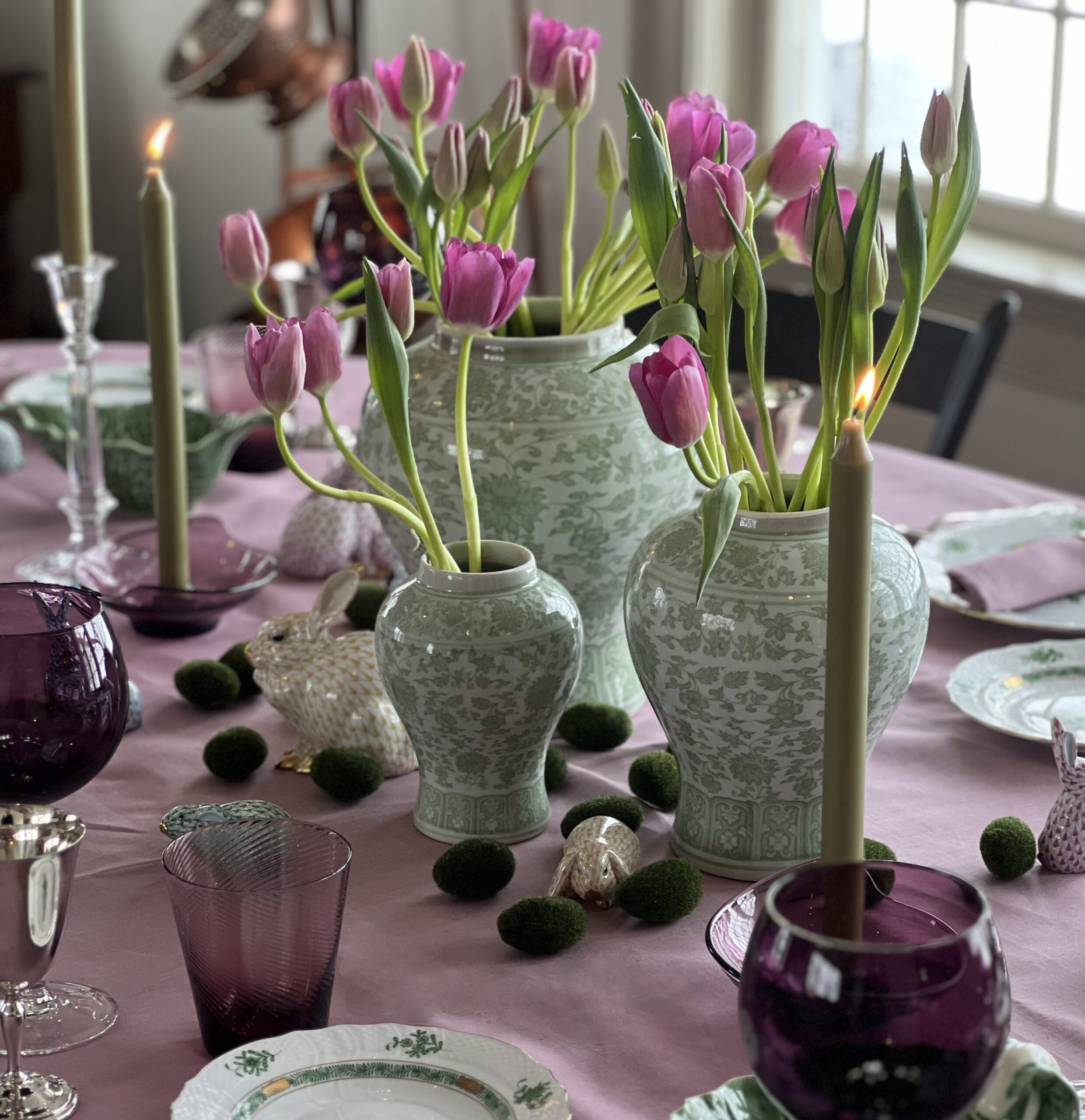Of all the Spring color options, this year we are loving a lilac Easter. Litchfield, CT interior designer Scott Francis put together this tablescape with the perfect balance of greens, blues, reds and pinks all grounded by the Huddleson Heather lilac linen tablecloth and napkins.