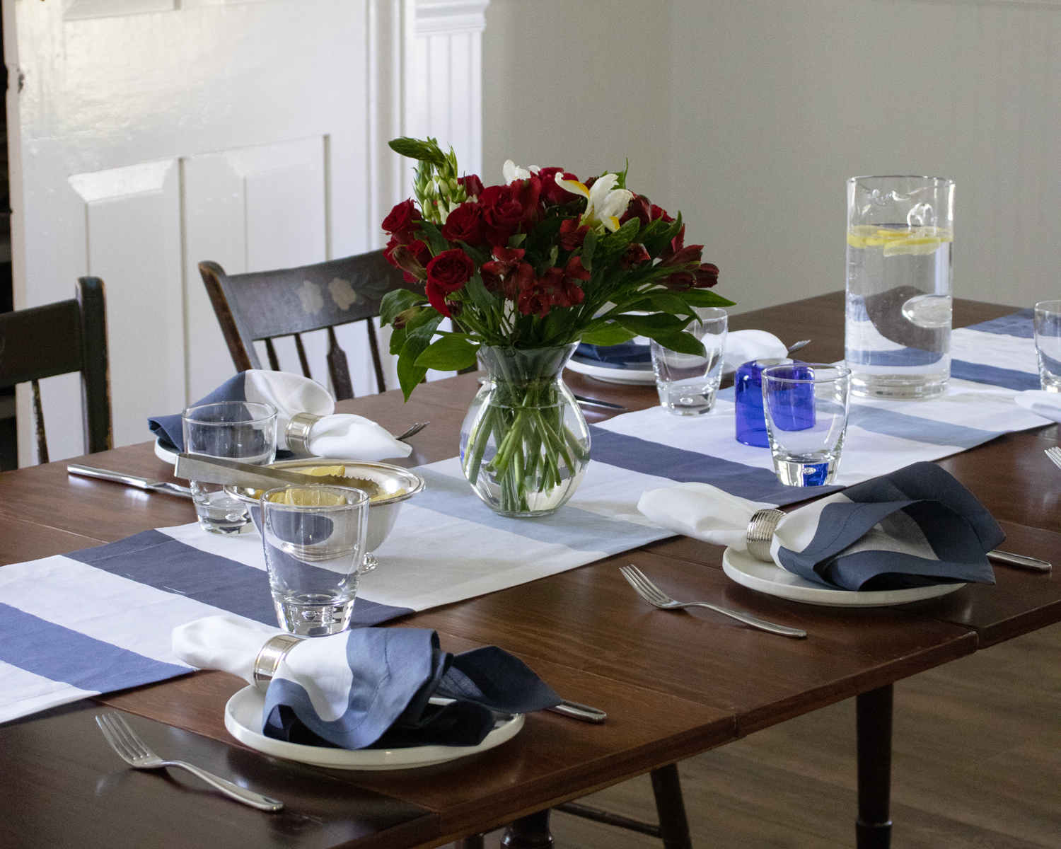 Our Cinta Blue collection of linens is available for bed and table. Above is the white linen placemat and napkin with the rich inky navy blue border. Below is the same napkin paired with the blue and white strip linen runner.