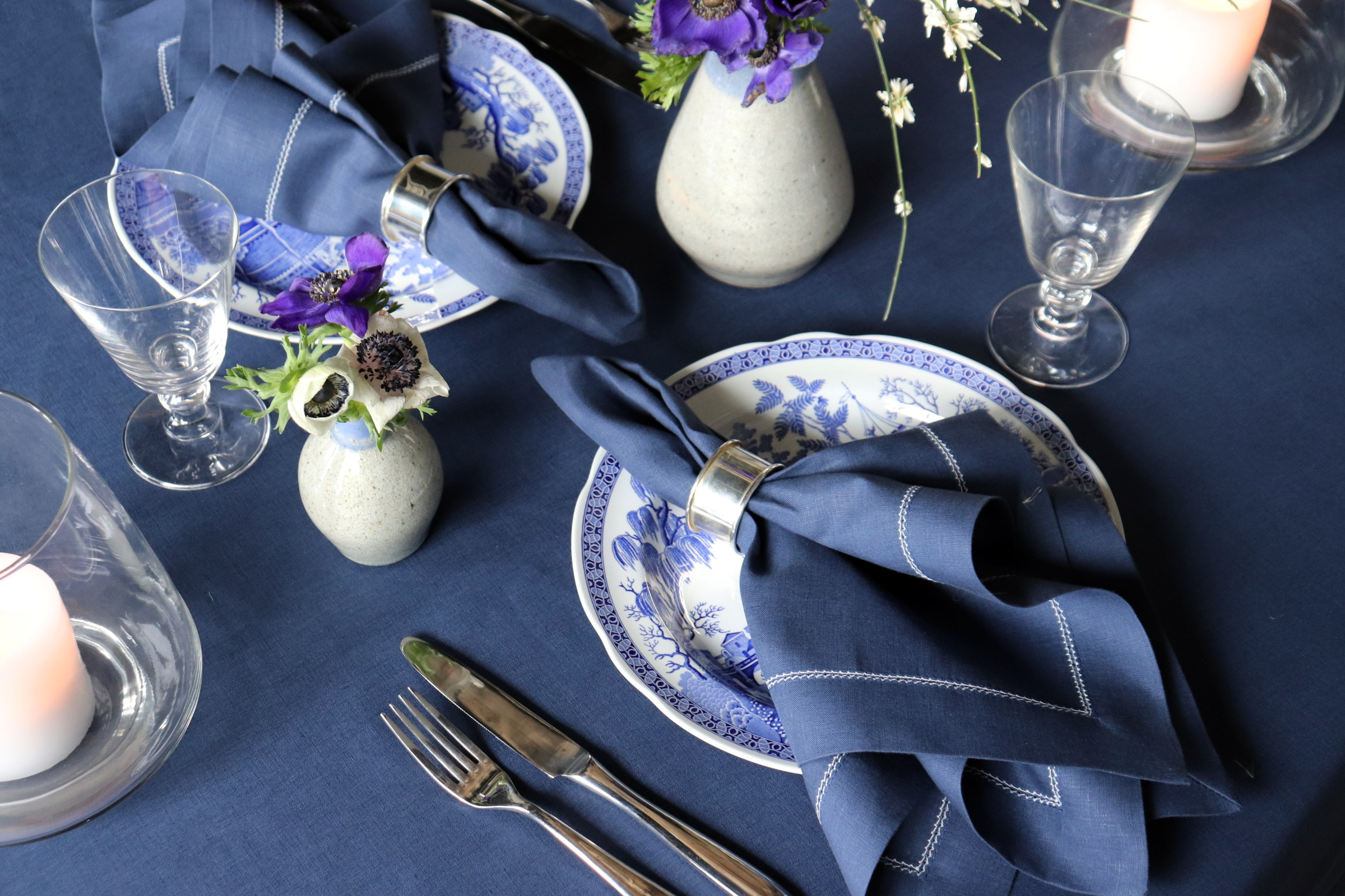 To give it your own curated spin, the blue and white Anfa linens pair beautifully with our solid navy blue linen napkins and navy blue linen tablecloth. The simple foraged bougainvillea runner brings the drama and instantly transports you to the Greek Islands.