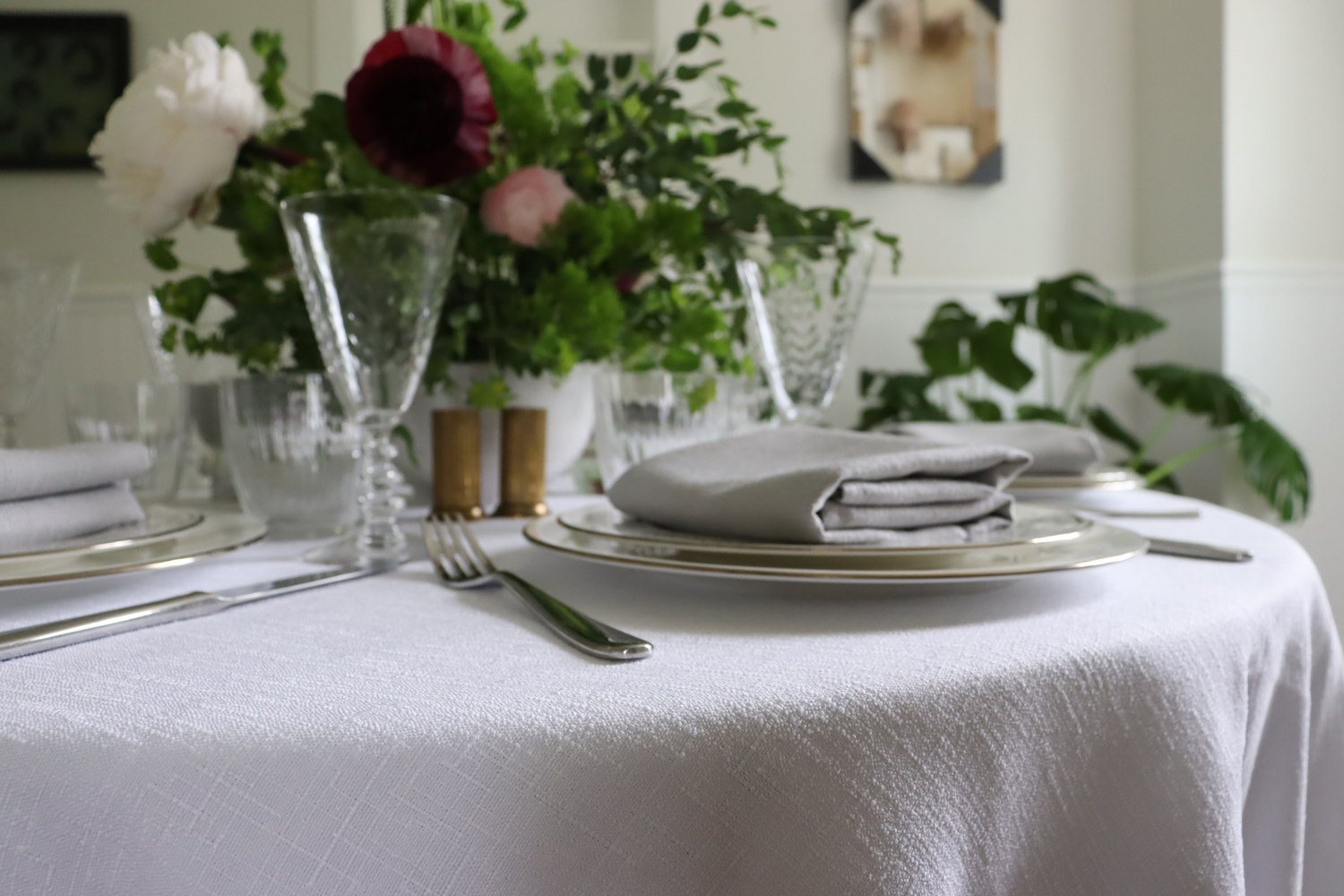 White Faux Linen Tablecloth & Light Silver Grey Faux Linen Napkins