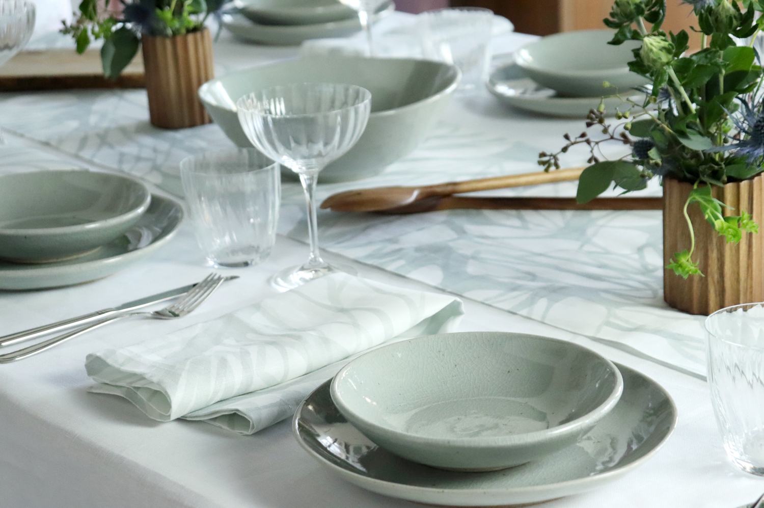 Green is a big trend for interior and table decoration this year - and we have many options in our printed linens and solid colors from the washy watercolor leaf print above through shades of emerald and aqua below. A beautiful way of echoing and toning with the shades of nature during the summer whether you're eating inside or out.