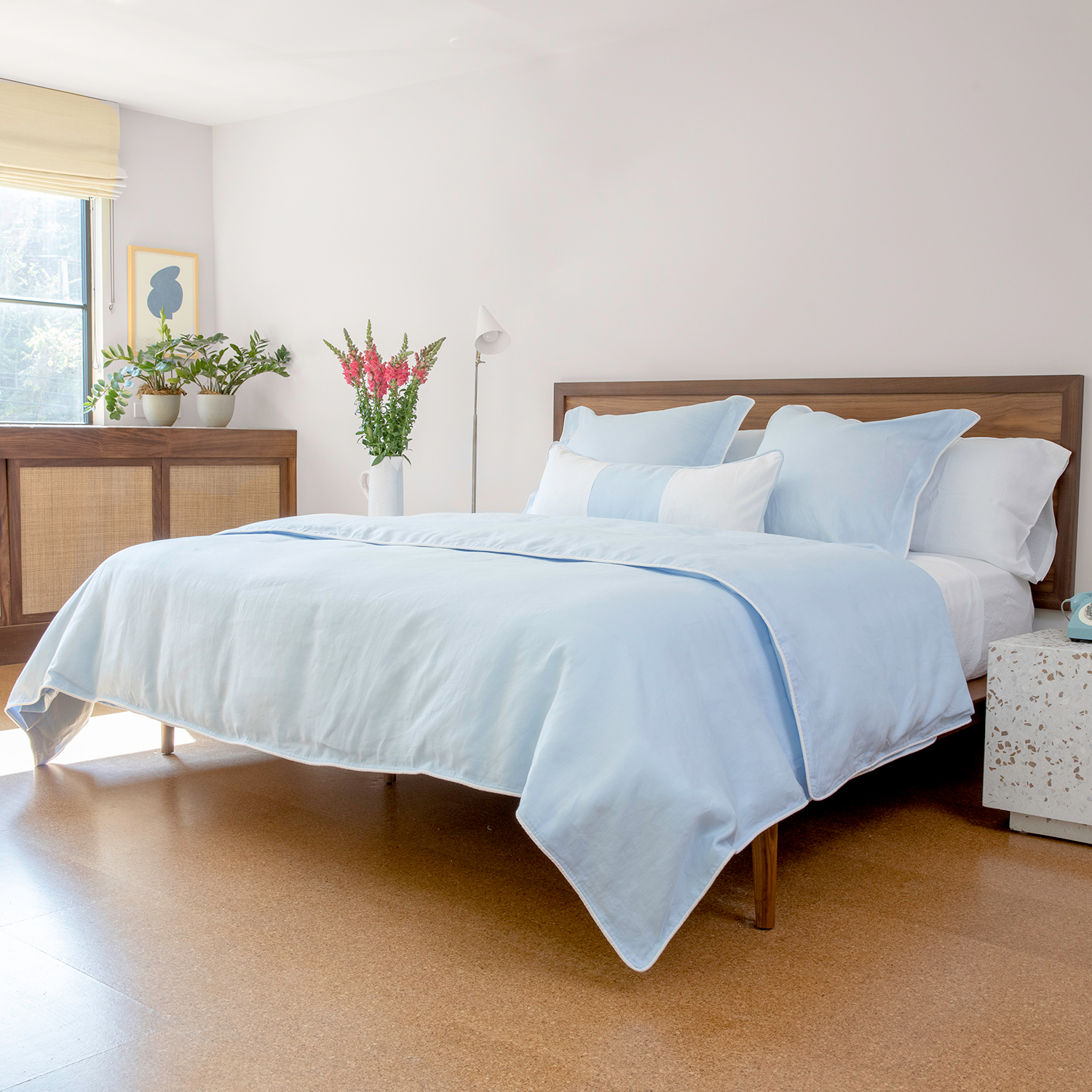 Our Sky blue bed linens come in both cotton (above) and linen (below). The cotton is a 500 thread count percale and are best cotton sheets for hot sleepers. Made from extra long staple American Supima cotton sheeting, the percale is cool to the touch, very breathable and has the perfect balance of softness and crispness. Our cotton sheets are finished with an elegant hemstitch detail.