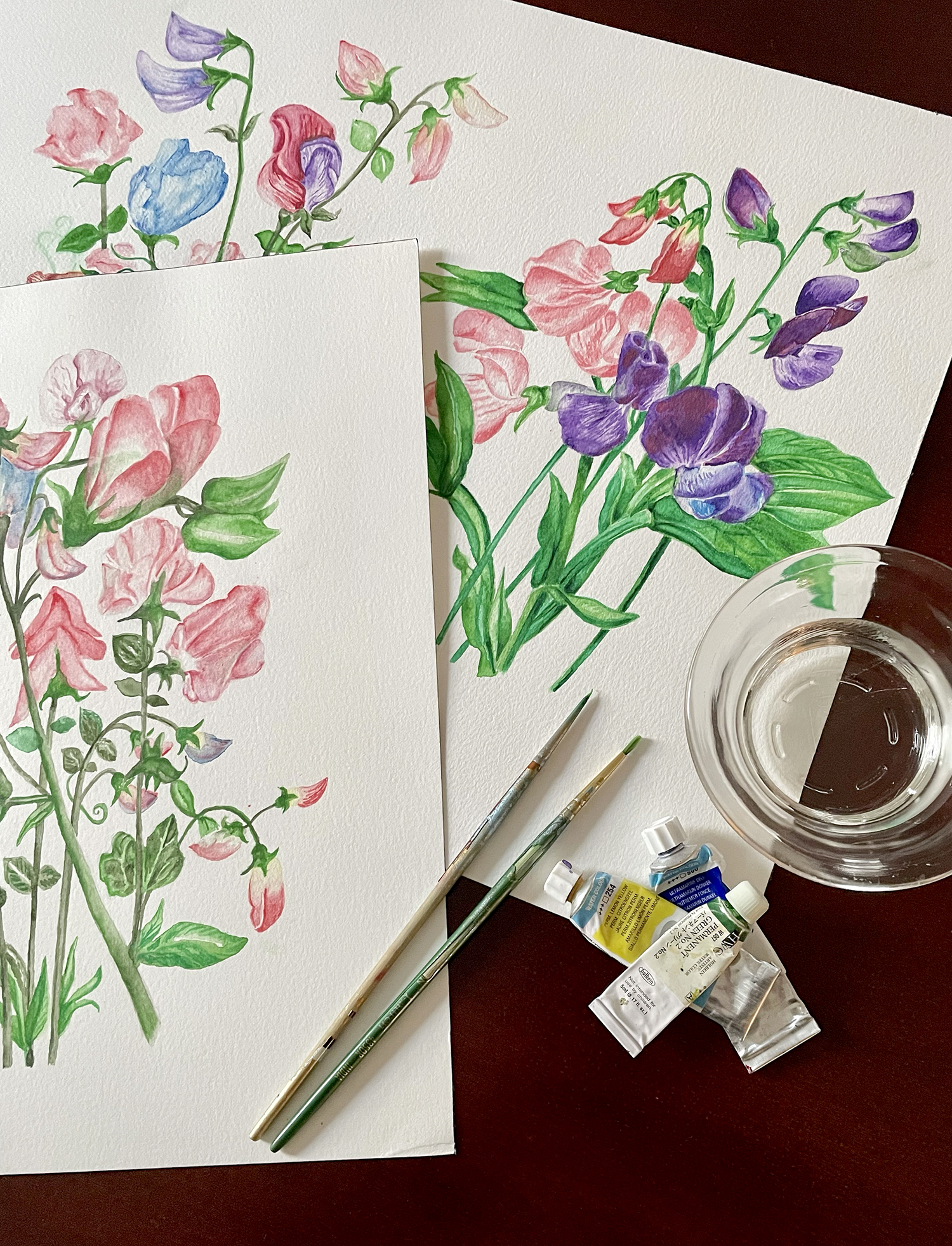 All Huddleson prints are created by us from scratch. These are the watercolor paintings for the Sweet Pea print. They are then scanned, cleaned up and laid out on the computer for the different linen sizes. The file is then sent to Italy where it is digitally printed and set onto linen. The printed linen is then shipped to us in California where we cut and sew it into finished pieces for you to enjoy in your home.