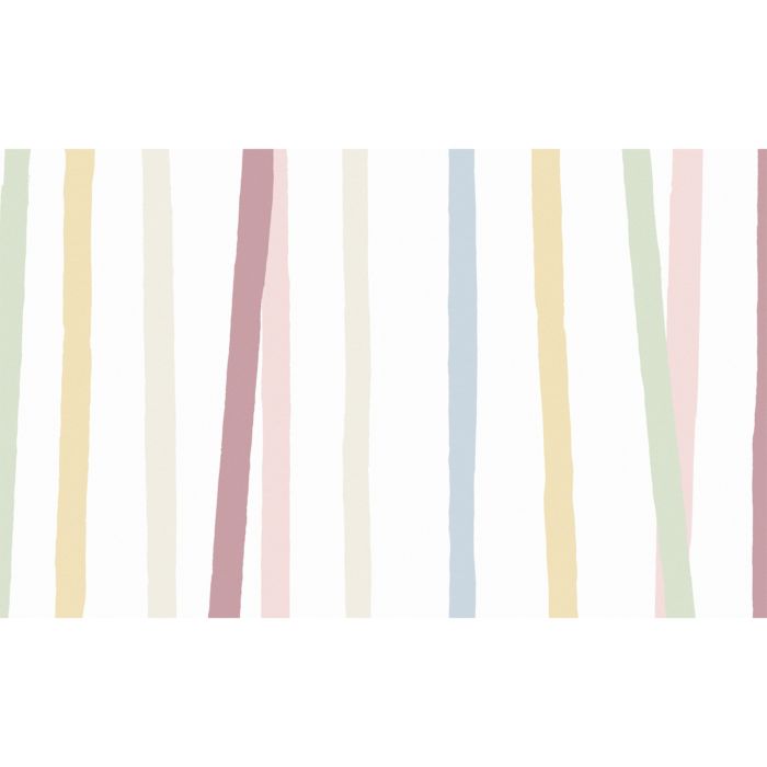 - – White rectangular linen tablecloth with stripes in a fresh, pastel palette of green, pink, gold, blue, ivory and red.