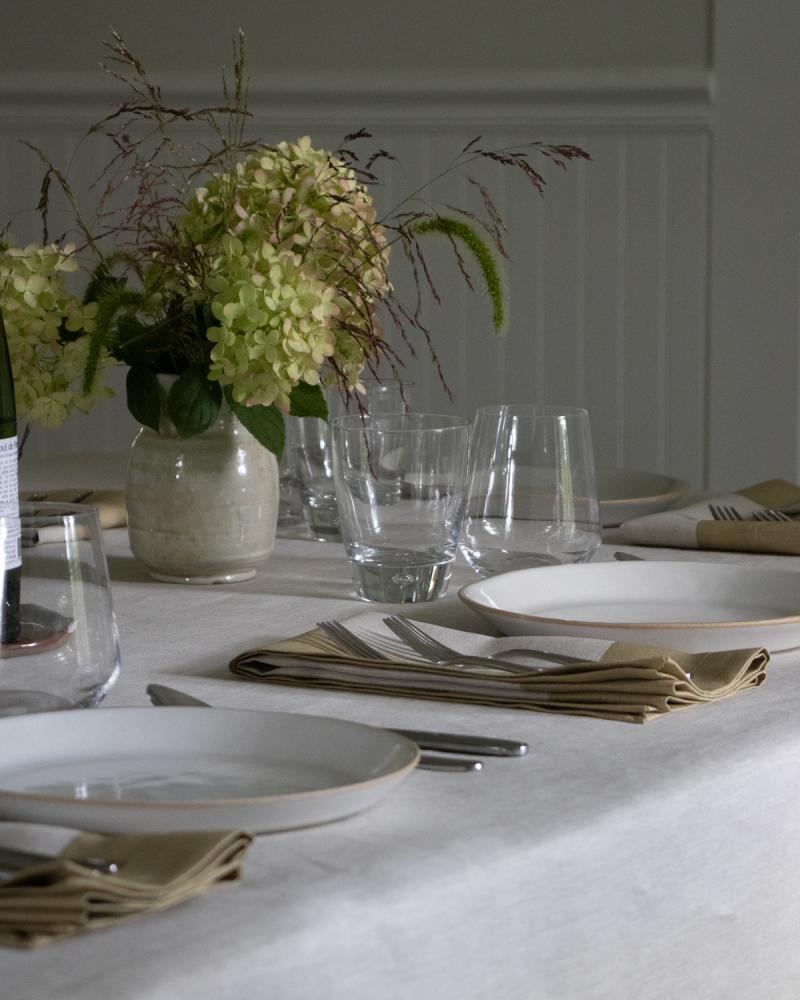 We specialize in table linens made from 100% linen woven in Italy and sewn by us in our California workroom. Our linen fabrics are 120” wide and are a fine, tight weave that drapes beautifully, has a timeless elegance and washes very well in the washing machine.