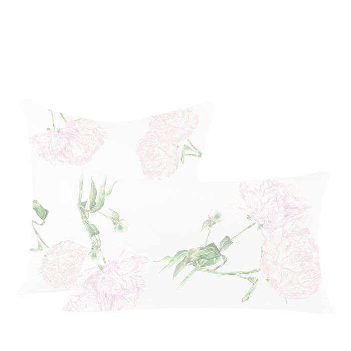 - – Decorative white Italian linen decorative throw pillow with a print of large pink Peony blooms